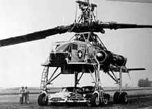 The XH-17 was a heavy-lift rotorcraft that was designed to lift loads in excess of 15 metric tons. To speed construction, parts of the XH-17 were scavenged from other aircraft. The front wheels came from a North American B-25 Mitchell and the rear wheels from a Douglas C-54 Skymaster. The fuel tank was a bomb bay-mounted unit from a Boeing B-29 Superfortress. The cockpit was from a Waco CG-15 military glider and the tail rotor from a Sikorsky H-19 Chickasaw was used for yaw control.