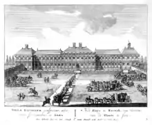 9. The cobbles have been misleadingly tinted green in the modern watercoloring applied to this engraving; the movements of coaches in the forecourt of both engravings show that it could not have been turfed.