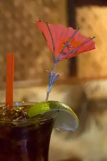 The restaurant serves American tiki-style drinks, including Mai Tais, Dark 'n' Stormy, Zombies, and drinks served in tiki-style glassware designed by Drew Brophy for the restaurant.[1][3][5] In 2018, Hula's introduced their version of a Three Dot and a Dash, a rum-based tiki drink from the post-World War II era. The drink comprises Appleton rum, falernum, allspice, lime and agave and is served at the Next Door bar.[2] Hula's has their own version of a hurricane made with three types of rum infused with vanilla and pineapple.[8] They also serve martinis, including one made of blood orange.[5]