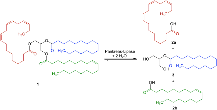 Pancreatic lipase, also known as pancreatic triacylglycerol lipase or steapsin, is an enzyme secreted from the pancreas. As the primary lipase enzyme that hydrolyzes (breaks down) dietary fat molecules in the human digestive system, it is one of the main digestive enzymes, converting triglyceride substrates like 1 found in ingested oils to monoglycerides 3 and free fatty acids 2a and 2b.[5]