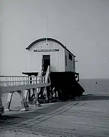 The lifeboat was moored at the end of a pier that sets out into the Humber Estuary (westwards from Spurn Head) rather than a traditional launch down a ramp into the sea (which is on the eastern side of Spurn Head). This location has been described as being in the lee of bad weather, thereby providing a safer place to set off from.[23] The crew have pushbikes to cycle down to the end of the pier and then use a boarding boat to get to the lifeboat.[24] Despite some buildings being erected to launch the lifeboat, even from the early days, it was recognised of the difficulties in launching the boat from land, so it has been traditionally moored away from the coastline.[25] A traditional lifeboat house with slipway was built in 1923 and used up until 1977, but it fell into disuse with bigger ships arriving that were better moored afloat. The slipway and lifeboat house were demolished in 1995.[9]