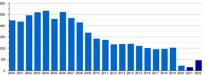Humberside Airport passenger totals 2000-2022 (thousands)