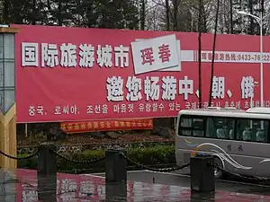 The Jilin–Hunchun intercity railway, a 250-km/h high-speed passenger rail line from Jilin to Hunchun via Tumen (吉图珲铁路客运专线), began construction work in January 2011, and was scheduled and finished at the end of September 2015.[17][18] The railway has been described as "Dongbei's most beautiful railway" (due to the terrain it runs through) and "the fastest way to Vladivostok" (4 hours by train from Shenyang to Hunchun, plus four hours by bus from Hunchun to Vladivostok).[19] Reflecting the border location of the city, the train station has its sign in four languages: Chinese, Korean, Russian, and English.[5]