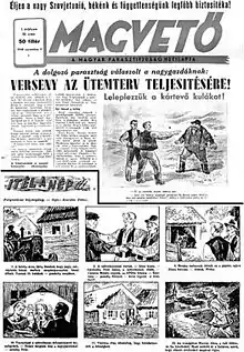 During this period the truncated Hungary was an ally of Germany. In 1937 the Minister of Justice began restricting the great amount of pulp literature and yellow press. In 1938 a decree ordered the whole press under the control of the Government. In the same year the "First Jewish Law" was issued.[28] Among others the goal of these two were to "clean" Hungary's cultural life, to eliminate pulp literature. As the Újság, a Hungarian extremist newspaper, commented in 1938: "These are not at all capable to nurture Hungarian self-knowledge, Hungarian honesty, Hungarian heroism, consequently to nurture the Hungarian folk, national and racial self-knowledge."[29] Since most of the comics were published in the mostly Jewish owned yellow press, comics vanished after the law took effect.[30] The situation became even worse after the German troops marched into Hungary: all leftist and liberal media was banned.[31] The only comics of the time were antisemitic ones, from magazines as the militant Harc (combat) or anticommunist ones from newspapers as Egyedül vagyunk (we are alone).[30][32]