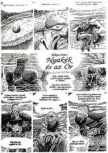 - Marcell Jankovics (Budapest, 1941–2021 )[81] animation director, cultural historian, illustrator. After finishing the Benedictine High School of Pannonhalma he wished to become an architect or archeologist, but was rejected twice due to his family background.[nb 5] He worked as an unskilled laborer, than from 1960 as an inbetweener at the Pannónia Film Studio. In 1965 he was promoted as an animation director. Sisyphus, directed by him, was nominated for the Oscar Awards in 1974, The Struggle won the Palme d'Or in the short film category in 1977 (to name two of more than forty prizes he won).[81] Between 1970 and 1971 he drew four adaptation-comics (scripted by Cs. Horváth). He described these works as a by-pass in his career, discovering that comics production requires much more work and pays less than animation – as he stated in an interview.[82] Although comics historians and critics praise his works for their art and stylistic diversity, they also agree on that the fact that he did not continue his career in this field, is a great loss to Hungarian comics.[83][84]