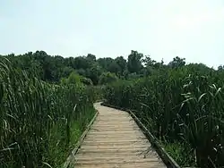 Huntley Meadows Park, the largest park operated by the Fairfax County Park Authority (1,452 acres or 588 hectares), is located in the Hybla Valley area of Fairfax County, Virginia, south of the city of Alexandria. The park features a visitor center, a beaver-created wetland with boardwalk, wildlife observation platforms, and an interpretative trail system. The park is home to abundant wildlife and is known for attracting many birds, amphibians, and plants that are considered less common in the region. Secondary-growth forest, sprinkled with several small, native-grass and wildflower meadows surround much of the wetland habitat. The main bodies of water that flow through the park are Dogue Creek at the western border of the park, Barnyard Run, the source of the park's Central Wetland, and the headwaters of Little Hunting Creek.[1]