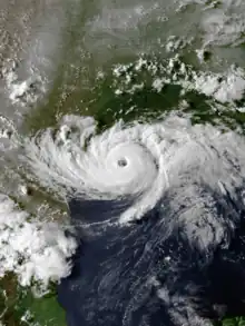 The storm's slow movement—averaging just 5 mph (8 km/h)—and lack of strong steering currents allowed Alicia to reap highly favorable conditions characterized by warm sea surface temperatures in excess of 84 °F (29 °C) and favorable winds in the upper troposphere due to an upper-level anticyclone, resulting in unabated intensification until landfall.[5][1] Radar analyses indicated that Alicia was stationary at times as it transitioned to a northwesterly heading.[5] An eye began to emerge on satellite imagery by the afternoon of August 16.[6] On August 17, Alicia strengthened into a hurricane with its pressure falling at a steady 1 mbar (hPa; 0.03 inHg) per hour.[1][4] At 06:00 UTC (1:00 a.m. CDT) on August 18, Alicia became a major hurricane and made landfall an hour later on Galveston Island—25 mi (40 km) southwest of Galveston, Texas—with maximum sustained winds of 115 mph (185 km/h) and a minimum barometric pressure of 962 mbar (hPa; 28.41 inHg) as measured by aircraft reconnaissance,[4][5] making it a low-end Category 3 on the Saffir–Simpson hurricane wind scale.[4] Alicia was the first hurricane to strike the continental United States since Hurricane Allen moved ashore South Texas in August 1980, ending the longest break in contiguous U.S. hurricane landfalls of the 20th century.[1][7] The hurricane was also the first major hurricane to impact the Greater Houston area since Hurricane Carla in 1961.[8]