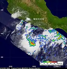 Hurricane Beatriz was a Category 1 hurricane that killed four people after brushing the western coast of Mexico in June 2011. The second named storm and hurricane of the 2011 Pacific hurricane season, Beatriz originated from an area of disturbed weather on June 19, several hundred miles south of Mexico, and gradually intensified. Gaining latitude, the system became increasingly organized and reached hurricane status on the evening of June 20. The following morning, Beatriz attained winds of 90 mph (150 km/h) as it passed roughly 15 mi (20 km) of Mexico. Due to its interaction with land, the hurricane abruptly weakened hours later. Early on June 22, Beatriz dissipated over open waters. Prior to Beatriz's arrival in Mexico, hurricane watches and warnings were issued for coastal areas. Hundreds of shelters opened across the states of Colima and Guerrero. Heavy rains from the storm triggered significant flooding along the Sabana River in Acapulco, killing four people. However, the overall effects of Beatriz were limited and the rains were largely beneficial in mitigating a severe drought.