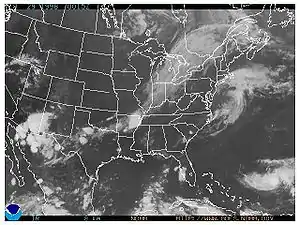 The storm accelerated somewhat by August 26, and early that day, it was moving at about 14 mph (23 km/h).[14] An approaching mid-level trough steered Bonnie north-northeast, and at 2100 UTC on August 26, the eye passed east of Cape Fear, North Carolina. The hurricane once again slowed, and early the next day, it made landfall near Wilmington, North Carolina as a strong Category 2 hurricane.[1] Doppler weather radar displays estimated that maximum sustained winds had quickly weakened to below hurricane intensity, and the storm was briefly downgraded to a tropical storm.[15] However, as the storm turned towards the east in response to the approaching trough, the center neared open waters and the winds began to re-intensify.[16] As a result, the cyclone re-attained hurricane status at 0000 UTC on August 28.[1] Offshore, the center began drifting roughly eastward.[17] Entering colder waters, hurricane status was lost at 1800 UTC that day, followed by an acceleration to the northeast.[1] The storm began to lose deep thunderstorm activity, and was forecast to lose tropical characteristics and become an extratropical cyclone within days.[18] By early on August 29, little connection remained over the western semicircle,[19] and only a band of such activity persisted to the southeast of the center.[20] Bonnie became extratropical around 1800 UTC on August 30, to the southeast of Newfoundland.[1]