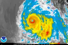 The strengthening trend was short-lived, however, as the cloud tops in the eyewall began to warm soon after it achieved peak intensity.[15] As Dolores approached Socorro Island, the cyclone underwent an eyewall replacement cycle and began to steadily weaken. The storm exhibited winds of 105 mph (170 km/h) as it passed within 20 mi (32 km) of the island. After completing the cycle on July 16, Dolores exhibited annular characteristics, with a symmetric and wide eye. The NHC described the eyewall as thick and "donut-shaped". Re-strengthening did not commence, as Dolores had moved over cooler sea surface temperatures.[16] Cloud tops briefly cooled, usually signaling the redevelopment of strong thunderstorms, but dry air had started to mix into the circulation.[17][18] Throughout the early hours of July 17, Dolores's structure continued to decay, with an eye no longer apparent and convection waning.[19] By 12:00 UTC, Dolores had deteriorated into a tropical storm, with no convection near its center.[20] With increasing northerly shear, the system eventually degenerated into a post-tropical remnant low about 300 mi (480 km) west of the Baja California coast on July 18. The remnant low slowly curved southward, before dissipating on July 22, a few hundred miles west of San Diego, California.[21][1][22]