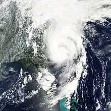 Moving through a weakness in the subtropical ridge, the storm turned to the north through the state.[1] Operationally, the National Hurricane Center downgraded Ernesto to tropical depression status while over the state,[10] though post-analysis indicated the system maintained tropical storm status.[1] Ernesto retained a well-organized cloud pattern over land,[10] and after emerging over the Atlantic Ocean near Cape Canaveral,[1] convection again increased and began wrapping into the circulation.[11] Upon reaching the Atlantic Ocean, Ernesto accelerated north-northeastward ahead of an approaching deep layer trough. The convection increased as the storm strengthened over warm waters, and late on August 31 Ernesto attained an intensity of 70 mph (110 km/h) while located about 170 mi (270 km) south-southwest of Wilmington, North Carolina. Shortly prior to moving ashore, an eye began to develop, and early on September 1 the storm made landfall on Oak Island, North Carolina very near the threshold between tropical storm and hurricane status. The National Hurricane Center remarked the possibility that Ernesto could have been a hurricane at landfall, due to the possibility that the strongest maximum wind was not sampled.[1]