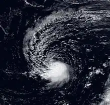 As it approached the United States, the storm slowed and began curving northward, passing 195 mi (314 km) east of Cape Hatteras, North Carolina. It weakened into a tropical storm on October 13.[1] For a time, the system's proximity to Tropical Storm Marco resulted in hints of the Fujiwhara effect, in which two tropical cyclone appear to rotate around each other.[3] A high-pressure area over Newfoundland steered Lili northeastward, away from the United States, and the tropical storm once again sped up.[1] It skirted the coast of Nova Scotia and transitioned into an extratropical cyclone on October 15, dissipating shortly after crossing southeastern Newfoundland.[4]