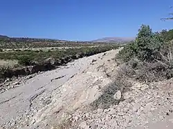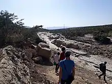Runoff mostly happens in the form of high runoff discharge events that occur in a very short period (called flash floods). These are related to the steep topography, often little vegetation cover and intense convective rainfall. The peaks of such flash floods have often a 50 to 100 times larger discharge than the preceding baseflow.[2] The magnitude of floods in this river has however been decreased due to interventions in the catchment. At Afedena, Sesemat, Tukhul and on other steep slopes, exclosures have been established; the dense vegetation largely contributes to enhanced infiltration, less flooding and better baseflow.[3] Physical conservation structures such as stone bunds[4][5] and check dams also intercept runoff.[6][7]