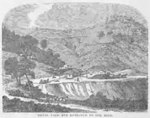 The news of the Mariposa Battalion's incursion into a valley (that the battalion members named Yosemite) for the purpose of tracking down alleged renegade Indians was fairly widely published, but the news focused on the confrontation. Hutchings was one of the few people to note the mention of a 1000-foot waterfall, and in 1854 when he was first formulating the idea of his illustrated magazine, he decided that a trip into that valley might make for interesting stories in the inaugural issue of the magazine. In the late spring of 1855 he hired artists to join him, and when the party arrived in the foothills he hired two Mi-Wuk men as guides. As the party came around Inspiration Point, they stopped long enough for Thomas Ayres to get a detailed sketch, which was published as a lithographic poster that fall, the first published image of Yosemite Valley. In June 1856, the entire account was published in Volume I of the magazine, and included five of Ayres' drawings.