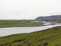 Thereafter, the river flows between Biskupstungur [ˈpɪskʏpsˌtʰuŋkʏr̥] and Hrunamannahreppur districts. Here, Hvítá combines with three other rivers: Tungufljót [ˈtʰuŋkʏˌfljouːt], Brúará, and Stóra-Laxá [ˈstouːra-ˌlaksˌauː], doubling the volume of the river. It proceeds to run through the flatlands near Grímsnes [ˈkrimsˌnɛːs] and behind Ingólfsfjall mountain. Just north of Selfoss town, it meets Sog River where it becomes Ölfusá as it flows into the Atlantic Ocean.