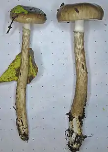The cap of H. olivaceoalbus is 3–12 cm (1+184+34 in) wide and is hemispherical in young fungi; they become flatter and wider with age, but they keep their characteristic dark umbo.[10] Underneath the slimy grey to sooty-brown surface, the cap cuticle is streaked with fine, dark grey radially arranged fibers.[18] Young fruit bodies are covered by two velum layers; the inner velum, composed of dark fibrils, becomes a ring or sheath (annular zone) on the stem that is covered by the gelatinous outer layer.[10]