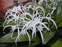 Hymenocallis caribaea [3] is a plant in the Amaryllidaceae with the common names "Caribbean spider-lily" or "variegated spider-lily." It is native to the islands of the Caribbean and to northern South America. It is regarded as native to Puerto Rico, Jamaica, Hispaniola, Cuba, the Virgin Islands, and the Windward and Leeward Islands, and the Venezuelan Antilles.[4] It is also commonly cultivated as an ornamental in many other tropical and subtropical regions and reportedly naturalized in Sri Lanka, New South Wales, Bermuda, French Guinea, Suriname, and Guyana.[5]