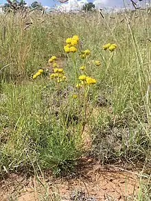 Hymenopappus mexicanus is a biennial herb up to 90 cm (3 feet) tall. One plant produces 1-20 flower heads per stem, each head with 20-40 yellow disc flowers but no ray flowers.[4]