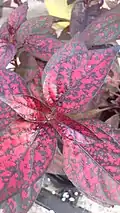 Hypoestes phyllostachya, the polka dot plant, is a species of flowering plant in the family Acanthaceae, native to South Africa, Madagascar, and south east Asia. The spots often merge into larger areas of colour.[1]