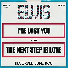 "I've Lost You" was covered by Elvis Presley. It was released in July 1970, debuted at number 85 on the Hot 100 on 1 August 1970, and reached number 32 on 29 August – 5 September 1970.[3] On the Cash Box chart, however, it reached as high as number 18.[4] It also charted at number five on the Adult Contemporary chart. The song became a gold record.