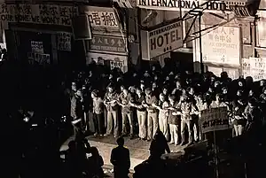 Community poet and historian Al Robles played a key role in organizing the broad coalition of protesters, as did International Hotel Tenant Association chairperson Emil deGuzman and tenants Wahat Tampao and Felix Ayson.[6] Ed Lee volunteered for the cause by working through the terms of various anti-eviction agreements as an attorney for the Asian Legal Caucus.[7] Asian American student activists from nearby University of California, Berkeley and San Francisco State University also joined the protests, volunteering to repair and repaint the I-Hotel so that it remained habitable for tenants even as the Four Seas Investment Corporation failed to maintain basic utilities.[1]