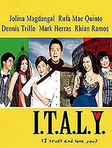 I.T.A.L.Y.: I Trust and Love You is a 2008 Philippine romantic comedy film directed by Mark A. Reyes. It stars Jolina Magdangal, Dennis Trillo and Rufa Mae Quinto. The film was filmed in three different continents: Asia, Europe and Africa.[1][2]