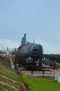 After decommissioning, the ship was towed to RK Beach in Visakhapatnam and was established as a museum ship, which is the first submarine museum in South Asia. The idea of the boat's conversion to a museum is credited to Admiral V Pasricha.[15] Towing the submarine 600 metres to its final location took 18 months and cost 55 million. It was converted as a museum by N. Chandrababu Naidu government launching from 9 August 2002, and it was open to the public from 24 August 2002.[5][16][17] Six retired naval personnel serve as guides and another one as the curator.[18]