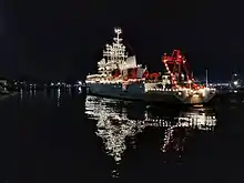 Internally, the ship has eight laboratories for various scientific disciplines, and a mini-operating theatre with medical staff. At the stern is handling equipment for mooring and retrieving oceanographic and acoustic buoys. It can accommodate up to 82 persons, including 16 scientists, and a crew of 8 officers and 58 sailors.[5]