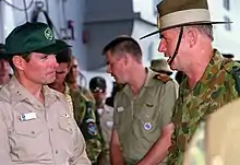 The Chief of the Defence Force, Admiral Chris Barrie, centralised strategic and operational planning for the projection of forces to East Timor at ADF Headquarters, bypassing the service chiefs in their role as senior environmental advisors. Treloar was appointed the Australian national commander, and Wilkinson became the Logistics Component Commander (LOGCC).[45] Commodore Jim Stapleton was appointed Maritime Component Commander (MCC), and Air Commodore Roxley McLennan became the Air Component Commander (ACC).[46] Stapleton was "dual-hatted"; as MCC (Commander, Task Group 645.1), he was answerable to Cosgrove (Commander, Task Force 645); but as Commodore Flotillas (COMFLOT) (Task Group 627.1), he reported to COMAST's Maritime Commander, Rear Admiral John Lord (Commander, Task Force 627).[47] Brigadier General John G. Castellaw, USMC, the commanding general of the 3rd Marine Expeditionary Brigade, was appointed commander of US forces (USFORINTERFET).[18] The 35-person USFORINTERFET staff arrived in Darwin on 20 September.[48] On 19 September, Barrie announced: