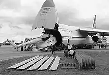 One of the two Mi-8 medium-lift helicopters from Bulgaria is unloaded from a Russian AN-124 transport