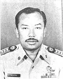 After several years of service, Oka reached the rank of major in 1970 and was tasked to attend the Army Command and Staff College. He finished from the college in 1972[5] and was appointed as the Commander of the Badung Military District after attending a short-term course for military district commanders, making him the first indigenous Balinese to ever held the post.[6] Two years after that, he was transferred to the Wira Satya (Bali) Military Regiment as the chief of staff of the regiment.[3] He ended his military career following his election as the Regent of Badung in 1975.[6] He retired from the military with the rank of brigadier general on 12 November 1989.[7]