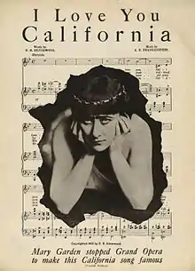 Later in 1913, the song was introduced by opera star Mary Garden, associated with the Chicago Grand Opera at that time. "Mary Garden stopped Grand Opera to make this California song famous," read the notices virtually ensuring the popularity and success of the new song. The renowned soprano wrote on stationery from the Hotel Alexandria in Los Angeles:
