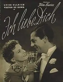 I Love You (German: Ich liebe dich) is a 1938 German romantic comedy film directed by Herbert Selpin and starring Viktor de Kowa, Luise Ullrich and Olga Limburg.[1] It was shot at the Johannisthal Studios in Berlin.[2] The film's sets were designed by the art directors Karl Weber and Erich Zander. It is in the style of a screwball comedy, inspired by the story of Adam and Eve.[3]