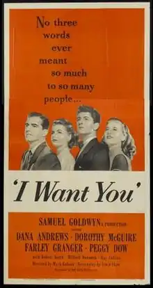 I Want You is a 1951 American drama film directed by Mark Robson taking place in America during the Korean War.[2] Gordon E. Sawyer was nominated for the Academy Award for Best Sound.[3][4][5]