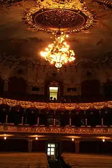 The ceiling and the iron curtain were painted by Alexander Goltz. The iron curtain, which completely separates the scene from the hall, shows ornaments placed symmetrically, while the ceiling has as a narrative basis the Archetypal Story, shown in paradisiacal allegories, with nymphs and cupids framed in rococo stucco.[10]
