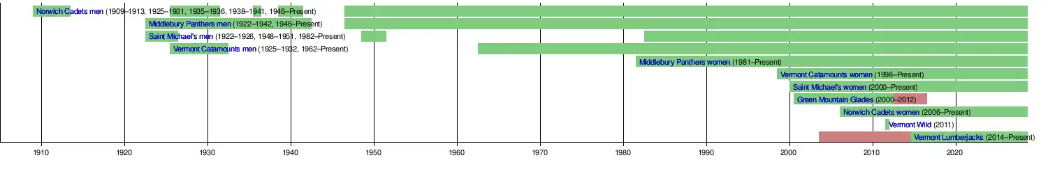 The close proximity to Canada afforded Vermont with a very close view of ice hockey as far back as the 19th century. Several local clubs were arranged but nothing formal occurred until 1909. One of those amateur teams was put together by a group of students at Norwich University. After garnering some interest from the student body, the school gave its blessing to the program and the first sanctioned team in Vermont hit the ice the following year. Unfortunately, a lack of facilities left the Cadets scrambling to find available ice and eventually forced the program to be suspended in 1913.[2] After World War I, ice hockey returned to the state when Middlebury began its men's program. They were joined that season by Saint Michael's which, aside from cutting down on travel costs, provided each with a local rival. With an increasing number of rinks in the state, Norwich was able to secure a home venue and return in 1925. That same year, the state's flagship university, Vermont also hit the ice, giving the state a solid foundation with the sport. However, after the great depression the cost of business became too much. During the 1930s, Norwich, Vermont and Saint Michael's were each forced to suspend operations. Only Middlebury was able to carry on through the difficulties.[3]
