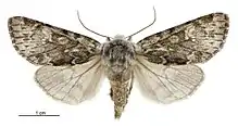 Face grey. Palpi blackish at base. Head and thorax grey, frontal area lighter grey. Head and thorax densely clothed with long dark-grey hair. Thorax broad in proportion to length, with a slight posterior crest. Abdomen grey. Forewings grey, with pale grey lines and occasional darker marks. A single light-grey line at base; a jagged grey line about 15, strongly dentate near dorsum; outwardly suffused with dark grey. Orbicular faintly shown in light grey, and separated from reniform by a distinct dark-grey patch. Reniform faintly outlined in light grey. A jagged light-grey line at 34, bending towards termen until centre of wing, then inwards before reaching dorsum. Terminal edge margined with light grey, edged basally with a dark suffusion, which forms a faintly defined line; slight grey marks along veins where they reach termen. Cilia short, light grey and dark grey alternate patches. Hindwings light grey with a faint ochreous tinge, a darker band across wing at J and a slightly waved subterminal band. Terminal edge and cilia grey-white. Underside grey with a faint ochreous tinge and a well-defined irregular dark-grey line at about 34 across both wings.[2]