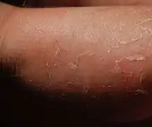 Over the first few weeks the redness disappears and is replaced by dry, flaking skin on the arms, legs and around the belly button.[5] Other areas of skin appear normal. The skin is fragile and is prone to blistering (caused by mild trauma or sweating).[5] After a few months hyperkeratosis develops with a dark grey or brown, ridged appearance on the ankles, knees and elbows.[4] Palms and soles are generally unaffected.[3] A slightly unpleasant, sweet odour may be present.[2]
