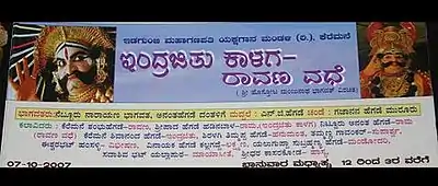 A banner indicating the performance of the Yakshagana, Indrajitu Kalaga - Ravana Vadhey by the Idagunji Mahaganapati Yakshagana Mandali