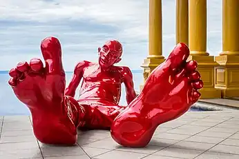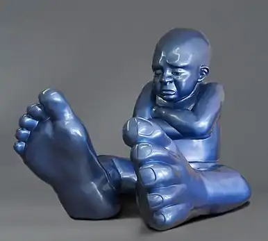 This idea of unity among the human race is something Zareski wants to express through his work.[6] The artist diverts and transforms the human anatomy in his sculptures: amplification of body parts, relaxing attitude, dramatization, pop and generous colours varying from metallic purple to bright green. These elements contribute to surprising the audience, while portraying a tranquil, peaceful message. A more detailed observation of the sculptures reveals a reflection and critique of our own humanity: these family members all carry an awareness message about cultural differences and origins.[7]