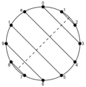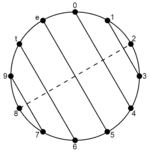 - "C-E, D-F♯, E♭-G, are different instances of the same interval [interval-4]...[an] other kind of identity...has to do with axes of symmetry [reflection symmetry rather than interval families' rotational symmetry]. C-E belongs to a family [sum-4] of symmetrically related dyads as follows:"