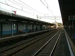 The station consists of two elevated opposed side platforms with the station building underneath.