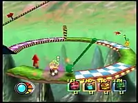 Power-ups, scattered throughout the 100 courses, equip the players with temporary special abilities.[3] Up to four players can participate. Modes of play include Arcade, Mix-up, Time Trial and Battle. There are initially eight characters to choose from, with an additional nine hidden characters that can be unlocked later.