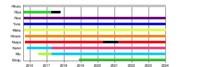 | Risa Minato (湊梨紗) | Green | September 2, 2001 | RisaChan Risachi | Graduated on October 14, 2017[3] |