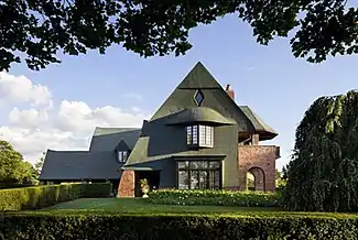 Period Homes called IKB's use of Shingle Style "a spur to creativity, to unorthodox speculation, to finding new answers to old questions,”[39] that often reconciled unusual or conflicting concepts, styles, and client preferences.[40][4] Ike & Kligerman's first shingle house synthesized two site-derived but contrasting styles—English Cottage (inspired by Lutyen's 1906 Folly Farm) and Shingle—into a hybrid style the firm dubbed "Shinglish."[40][23] Writers described the result, Shinglish Country House (Deal, New Jersey, 1993), as whimsical, with a steeply sloping, flared roof suggesting weightlessness, and earthbound, anchored by massive curved buttresses constructed from irregular clinker bricks.[47][22] The ICCA Stanford White Award-winning Black and White House (Connecticut, 2011) drew on historical English and Swedish country precedents, including details from the 18th-century home of botanist Carl Linnaeus; the rambling, two-story structure's graphic exterior featured a black-painted board-and-batten treatment with white trim on one façade and stark white stucco on the other.[48][7][17] The Arts and Crafts Retreat (Michigan, 2003) similarly harmonized English, Swedish and pan-European elements in the crafting of its exterior and interiors.[39][47] In the Southampton Beach House (Long Island, New York, 2014), the shingle style synthesized an array of forms and features: gables, dormers, flared eaves, curved outer walls, a belvedere, and a prominent, sculpturally anchoring chimney.[6][46] Architectural Digest described the home as refreshing, an "authentic homage to the asymmetrical lines and inventive quirks that […] are Shingle Style's hallmarks."[6]