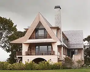 IKB often placed Shingle Style in what some call "productive tension" with modernist design; its hand-hewn visual roughness and emphasis on traditional materials and craft offered a counterpoint, yet shared modernist interests in functionality and composition.[46][49] For example, Watch Hill Aerie (Rhode Island, 2014) balanced classic New England Shingle vernacular with contemporary flair, drawing on the geometry of origami and the notion of a sculptor carving out form from a block of marble to create unique, near-abstract volumes.[39][33] Period Homes wrote, "Architectural juxtaposition abounds in this new, old house,"[39] whose maritime-inspired shapes, colors, details and décor reflect its water-edge location.[33][40] In other cases, such as Southampton Beach House and the Sagaponack House (Rhode Island, 2014), this reconciliation occurred within the homes; both combined classical shingle exteriors that match indigenous architecture with spare, modern interiors.[6][50][47]