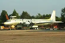 The airframe is based on the Il-18, with the wings moved forward 3 m (9.84 ft).[4] Unlike the Il-18, only the forward fuselage of the Il-38 is pressurised. The tail contains a MAD, while under the forward fuselage a Berkut ("Golden Eagle") search radar (named "Wet Eye" by NATO) is housed in a bulged radome. There are two internal weapons bays, one forward of the wing, housing sonobuoys and one behind the wing housing weapons.[2]