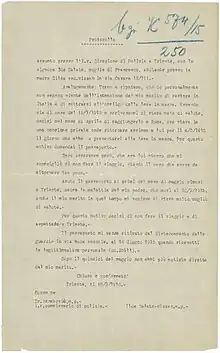 At the beginning of 1915, already into World War I but before Italy's entry in the conflict, her husband was sent to Rome thanks to an Austro-Hungarian mandate for the importation to Istria of extra provisions. He then decided to stay there, to fight for Italy's entry into the war, which would indeed occur a few months later.[7] In the correspondence between Mizzan and Salata from the beginning of 1915 to Italy's entry into the war, it can be perceived, behind the rigidity of war censorship (which forced them to discuss only ordinary, day-to-day arguments), the growing consciousness in Mizzan that her husband would not return home.[1]
