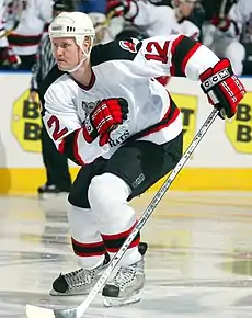 The Devils re-signed Pikkarainen at age 28 on July 2, 2009, intending to keep him on the NHL roster.[1] After missing the Devils' first game of the 2009–10 season with the stomach flu,[2] Pikkarainen made his NHL debut on October 5 against the New York Rangers, and later scored his first NHL goal against the Montreal Canadiens on December 16, 2009. In January 2010, Pikkarainen cleared waivers to play in the KHL for CSKA Moscow after the Devils had decided that he was unable to fully adjust to the NHL style, partially due to health reasons.[3]