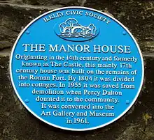 • 1955–1961: The Old Castle — Ilkley Manor House's current building - became available to the Museum but was facing demolition and required cash and conversion from cottages into one building. Costs were quoted at £7,000-£10,000, but there were contributions from Ilkley Urban District Council and Percy Dalton, and a grant from the Ministry of Works. The Manor House Museum and Art Gallery was opened on 8 July 1961.[8]